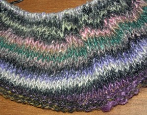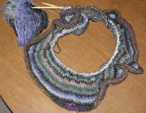 One thing that eight hours of flying time is good for is knitting. Alas, my new project — a pullover type of shawl knitted on circular needles. I’m using this really pretty Noro yarn called Silk Garden in color #243 and 36″ size 10 circular needles. I didn’t have the pattern to start it with, so I cast on something like 220 stitches. My friend Jill and I are doing this at the same time. At first, we both cast on what seemed like very few stitches (i.e. it wouldn’t fit around our shoulders) which is why I started over. We just got the book back in stock at the shop and I looked up the pattern. Turns out that you’re only supposed to cast on 158 stitches, so mine may be a little loose. Oh well! The striping is turning out really neat – can’t wait to see what it will look like in the end. Check back in about 6 months – hopefully I’ll have it done by then — LOL!