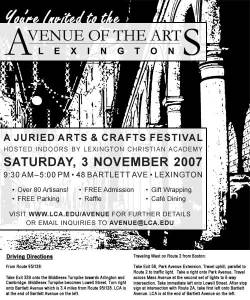 I’ll be at the “Avenue of the Arts” craft show in Lexington, MA on Saturday, November 3rd from 9:30 am to 5 pm. Some of my fellow artists that will also be there are Jen from Bellina Designs (http://bellina.etsy.com/), Andrea Karis, Teeru Bihani, and Kristen of Think Pink Crafts (http://thinkpinkcrafts.blogspot.com/). I will be selling greeting cards (get ready for the holidays!), photographs (framed, unframed, and as greeting cards), and possibly some sewn tote bags (have to get my butt in to gear – yikes!). There will be many great, local artists there selling things from jewelry to clothing to fun gift items so it’ll be a great way to get some of your holiday shopping out of the way. They are also doing a bunch of raffle drawings throughout the day — you could win a dozen of my holiday cards!