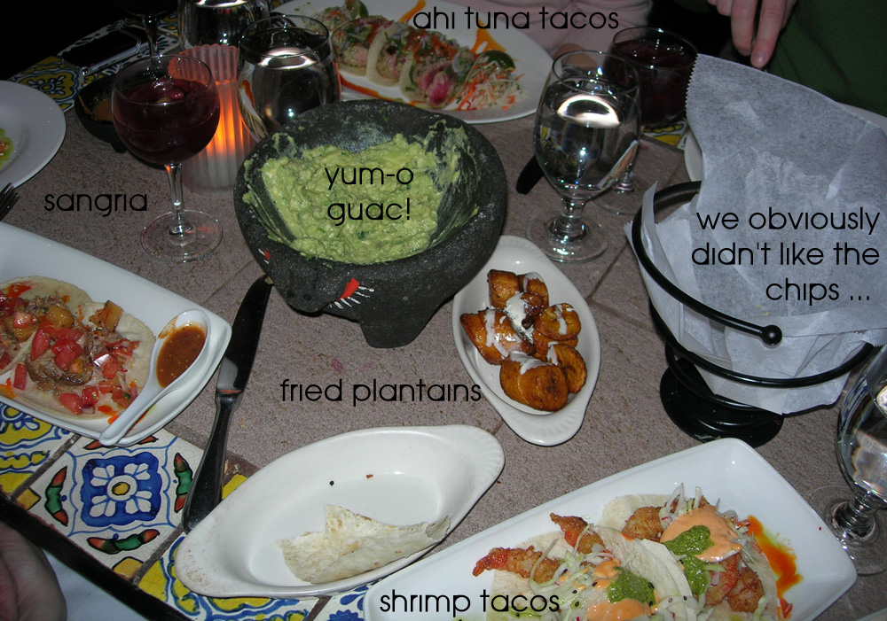 We went to this great Mexican restaurant called Ole in Inman Square the other night with some friends. They have such good food there and the best sangria!! They’ll make the guacamole at your table, too. So much fun and so much good food! This is what one half of our table looked like …
