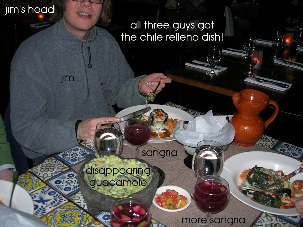 … and this is what the other side looked like. Funny enough, the guys all got the same chile relleno dish! I got the fried shrimp tacos and pork tacos as usual. Man oh man, we left soooo incredibly stuffed and slightly tipsy from three pitchers of the sangria. 🙂