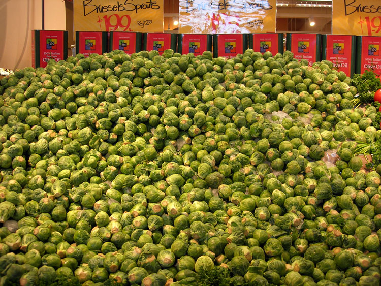 Anyway, before that, I asked someone that I thought worked in the produce department if they had any brussel sprouts. After being taken to the baking aisle and then asking the guy again if he knew that I had asked for brussel sprouts, he led me back to the produce section to a woman. She didn’t know what I was talking about so she got a real dude that worked in the produce section. After I asked him where the brussel sprouts were, he – probably laughing in his head thinking I was a total moron – led me to this giganomous display at the front of the produce section that I obviously (read: stupidly) did not see. Wow. I have to say that that is a brussel sprout lovers’ dream of a display. You get to pick your own! Woo hoo!