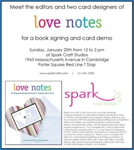 Join us in celebration of Spark Craft Studios’ first publication on Sunday, January 20th for a “Love Notes” book signing event. I’ll be there with the two editors plus one of the other card designers, Renee DeBlois, between 12 and 2 pm with treats and a card making demo.