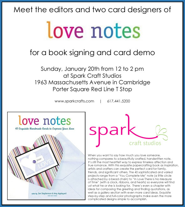 Join us in celebration of Spark Craft Studios’ first publication on Sunday, January 20th for a “Love Notes” book signing event. I’ll be there with the two editors plus one of the other card designers, Renee DeBlois, between 12 and 2 pm with treats and a card making demo.