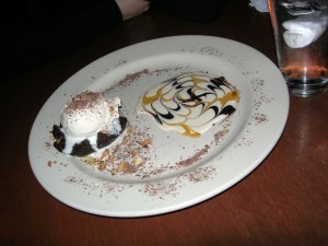 Sadly, the desserts disappointed us … again, almost all of them had nuts in them. So we decided to skip out and drove over to Daedalus in Harvard Square. We had the Chocolate Explosion dessert – warm flourless chocolate cake with creme anglaise, chocolate sauce and then we substituted the vanilla bean ice cream for coconut ice cream. Wow. It totally hit the spot.