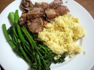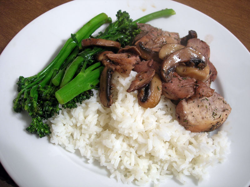 For dinner, I made half based on something I saw Rachael Ray make on TV and half based on what was in my head. Basically it was chicken cooked with shiitake and crimini mushrooms cooked with some olive oil, a couple cloves of garlic and Bordeaux wine over couscous (for Tony, rice for me) with brocolini. Yummy.