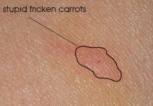 And to end this depressing post on an even more sad note (is that possible?!), I decided to test two things whilst at a friend’s house this past weekend. (Note: no, I don’t always carry a lighter and sewing pin around with me to conduct these do-it-yourself prick tests.) They were white wine and celery. The good news? White wine. No bump. The bad news? Celery. Whooda thunk? I didn’t have my camera with me to take a photo of that fairly large bump, but I did find this out on Wikipedia that was kind of shocking:
