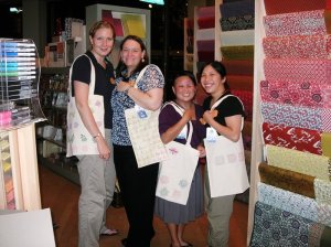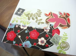 At the first station, we made a travel portfolio out of two 5″x7″ envelopes and some of their large circle stickers. At the second station, we made collage postcards which were scanned and then printed out for us later. We got five of our own images, so the five of us swapped with each other and went home with five different designs. At the third station, we used rubber stamps and clear embossing powder to decorate our own tote bags.