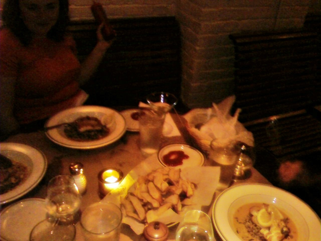 We decided to have dinner inside the restaurant. Wow, what a cool place! We sat downstairs which is where the stage is located. They have lots of exposed brick, old chandeliers, and burlesque decor. The bathroom was kind of dark but also pretty cool with old, antique mirrors over the sink. The seating at our table was a little awkward because it was like a bench and the table had kind of weird angles, but we made it work.
