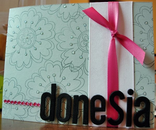 My coworker, Donesia’s, birthday was on Friday so she got to celebrate a fun 08.08.08 birthday this year. I made this card for a bunch of us at the office to sign for her using a Stampin’ Up! stamp that Liz gave to me with my last order (thanks, Liz!). I am really into the idea of using large, decorative stamps as backgrounds these days. I love how the foam letter stickers stand out on this card.