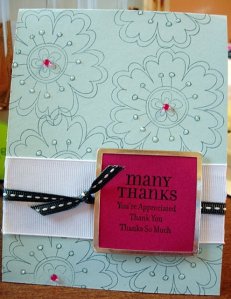 I’m also really diggin’ this pink and blue combination for some reason. I just think it goes so well together, so I made Liz a thank you card to thank her for the flower stamp (silly, I know!). Renee loaned me her Making Memories tag maker tool, so I used it around the stamped “many thanks” image. Again, lovin’ that background stamping!