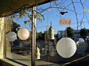 And this is just a shot of the store’s window front. I think it’s so cute how they hung up lanterns and these birds made out of decorative paper.