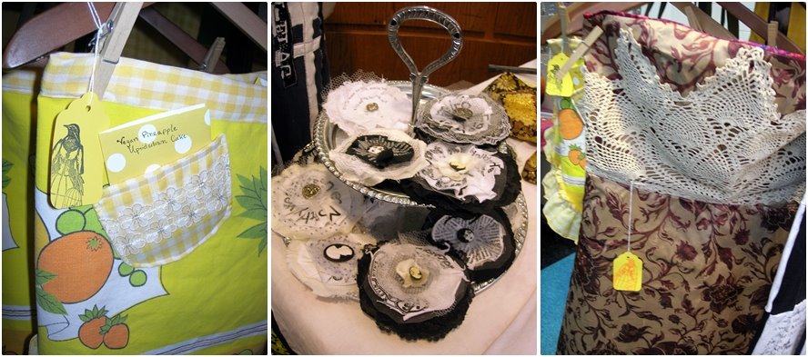 Anyway, we began the morning with coffee and pastries at Bloc 11 in Union Square as usual. (Must look into getting stock in this place – seriously!) Had my usual egg sandwich and large latte – yum! Then we drove over to the Design Hive Market to see our friends Libby and Bren. Libby (Whistling Sparrow Designs) is a very talented sewer (is that a word?) and makes the neatest things like aprons, dresses, and cute little brooches. Check out this pineapple apron she made, complete with a recipe for pineapple upside tucked in the pocket!