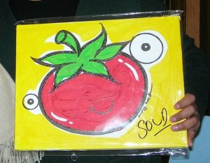 Renee commissioned this tomato painting from Bren Bataclan. Isn’t it cute?! Our friend, Kristen, bought an eggplant from him a couple of weeks ago so we told him that he should do a whole line of veggies. Tony and I are thinking that it would be so cool to have Bren come paint our baby’s room in the future.