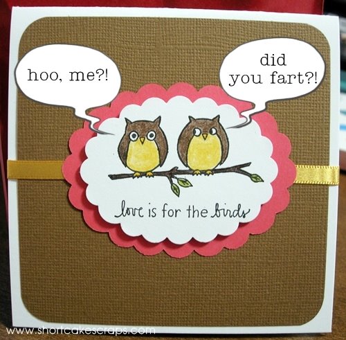 One design I made consisted of a funny owl stamp that cracks me up each time I look at it. The look on their faces makes me imagine a “did you fart?” conversation for some reason. Can ya see what I mean?