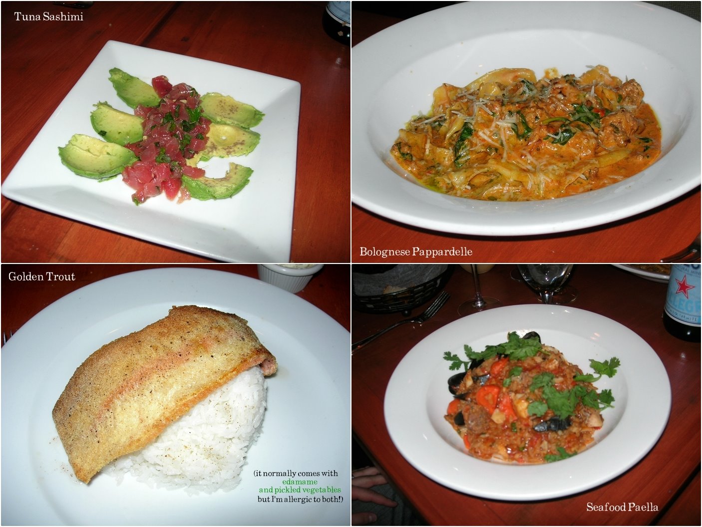 For dinner, Tony had the seafood paella with saffron rice, fish, chorizo, mussels, and roasted tomatoes. Marina originally wanted to get the tuna sashimi dish but the waiter said they were out of the other components that they normally use to make that dish since they had a wedding at the restaurant earlier that day. So they compromised and brought out just the tuna with some slices of avocado and lemons. Joe had the bolognese pappardelle with an almond and basil pesto sauce. I had the golden trout dish over jasmine rice. I know that it looks rather plain in the photo below, but it’s normally served with edamame and pickled vegetables and since I’m allergic to both I asked them to omit them.