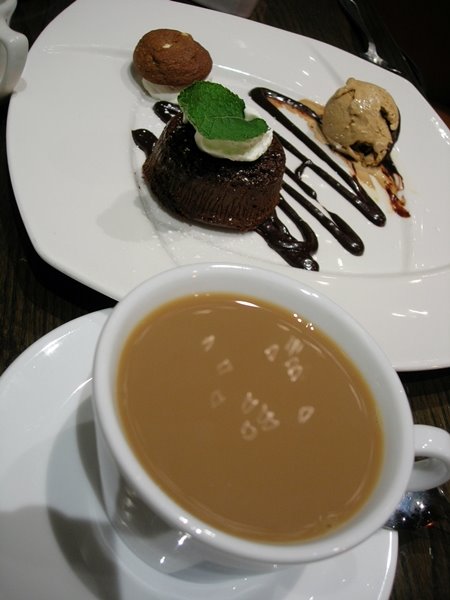 And the detail that my husband doesn’t know about is that we shared their flourless Valrhona chocolate cake that came with a coffee-white chocolate chip cookie and coffee ice cream. Yum. Bad, bad yum.