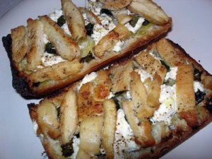 Sort of like pizza, but not really I guess. I found this delicious Ciabatta bread at Star Market (that I can eat – hooray!) and so I grilled some chicken, toasted the bread in the oven with a little bit of olive oil, slathered on some goat cheese, sprinkled on some fresh basil, and then zapped the whole thing under the broiler for a few minutes. Voila! A delicious pizza-like dinner. 🙂