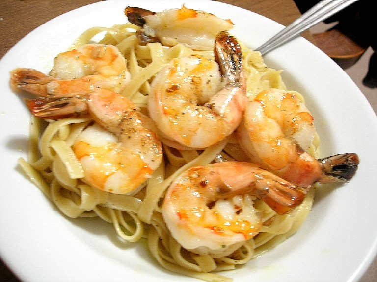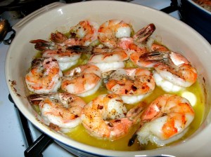 I’ve never cooked with prawns before, so I Google’d for a recipe. I found a bunch but decided to just roll with it in the end. I put them in a single layer into two casserole dishes – one with just garlic, olive oil, and black pepper for me; one with garlic, olive oil, and cracked red pepper for Tony. Baked them for 10 minutes in a 425 degree oven, and they turned out pretty good. Oh and I added a little dab of butter when I took them out (read that in a couple of the recipes).
