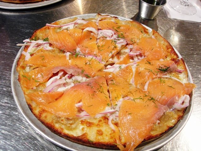 Anyway, this time I had one of their chalkboard special pizzas: Maine Ducktrap Smoked Salmon, Creme Fraiche, Caramelized Onions, Fontina Cheese, Red Onions, Capers, Dill, and Lemon Vinaigrette. But because of allergy reasons, I omitted the capers and lemon vinaigrette. I got a little bit of olive oil on the side in case it was dry, and that worked perfectly fine.