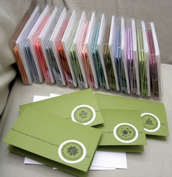I managed to put together these little 4-packs of note cards in a variety of colors, I think 14 packs total. Each set contains one each of four greetings, plus the envelopes. I hope they go over well at SOS.