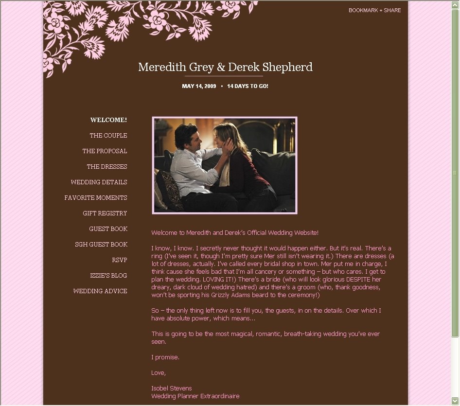 It’s a wedding website for Meredith and Derek, how funny and weird is that?! It’s funny because they do seem like a real couple in a lot of ways (maybe because millions of viewers have been watching their relationship grow over the past couple of years?) but this is a little strange to me.