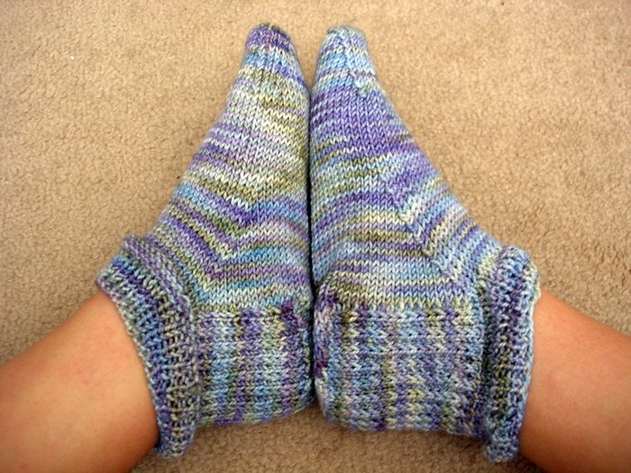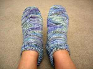 Okay, not exactly sure when I started these (four weeks? five weeks? no, six+ weeks ago really??!) but I finally decided to just take them home and finish the toe on the second side last night. Voila! Not the most perfect pair but hey, they’re my first!