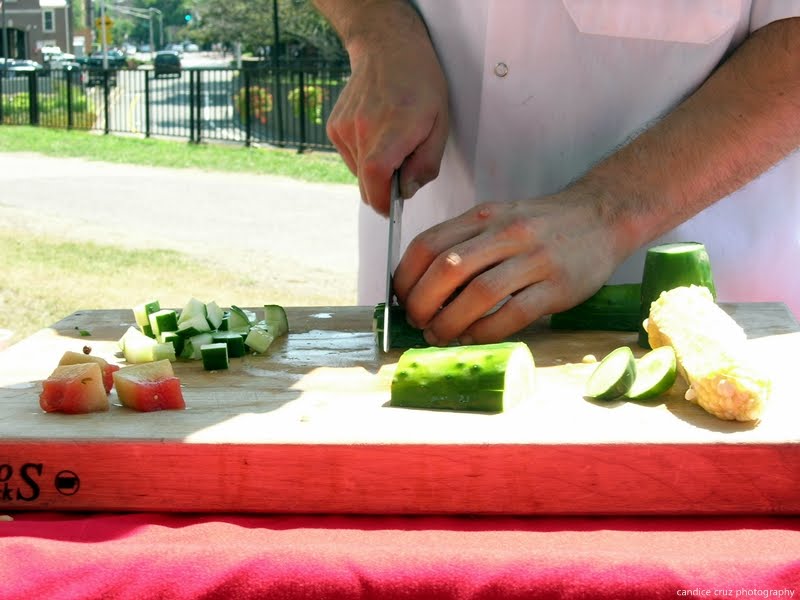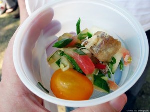 I ended up getting a ball of fresh mozzarella from Fiero di Nonna (so sweet and good!), a couple of small yellow tomatoes, blueberries, and a cucumber. And then we stopped off at the “live cooking demo” table where there were two chefs from Hungry Mother putting together a dish they called “Caveach”.
