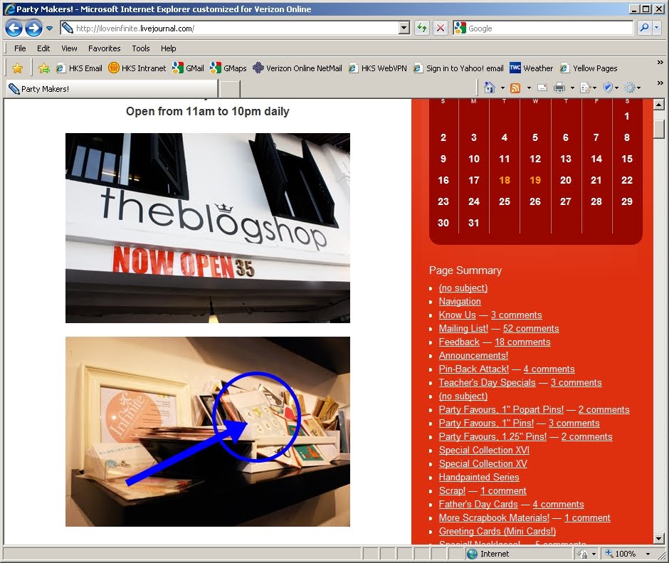 Circled in blue (that was my doing) is one of my greeting cards!! It’s a long story but basically it’s in Singapore being sold at a little boutique shop called the Blogshop (how appropo, no?) through a company called Infinite.