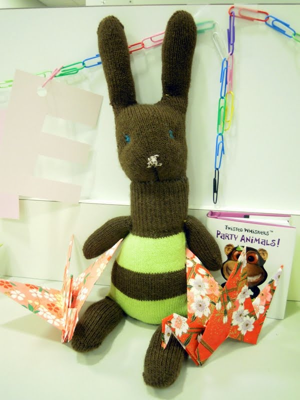 Isn’t he adorable??! (Yes, we’ve been telling her for a long time that she needs to sell these on Etsy …) I don’t know why I assume it’s a he. It just looks like a he to me. He’s very cute, that’s for sure. I should take a picture of his tail for you, but that might be border-line glove rabbit x-ratedness.