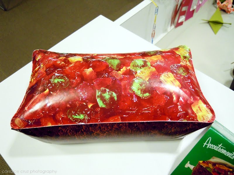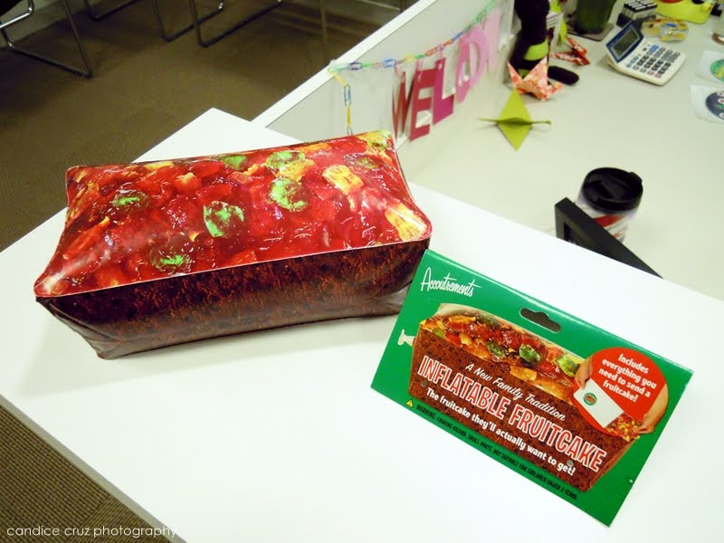 Yes. That is an inflatable fruitcake. And as it says on the website where you can order it, “It’s festive, it’s traditional and it’s inedible – just like the real thing.” Ha! I’ve never been a fan of fruitcake myself (although my mother and sister both love it) so I didn’t mind putting up this vinyl version for decoration on my desk. (And no, I didn’t purchase this!)