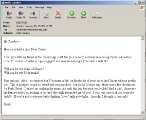 Fast forward a couple of years and to the fact that we ran into each other a little while ago at one of the Design Hive craft shows. And now to this email.