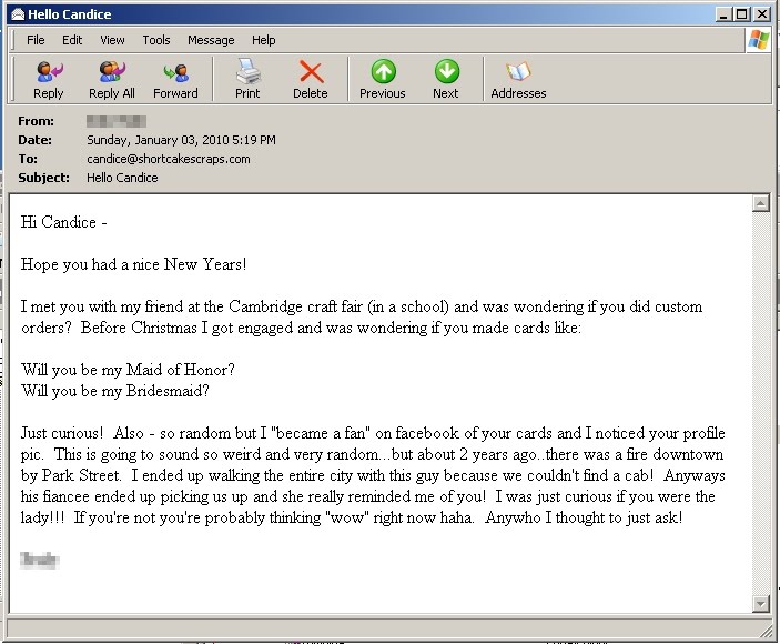 I received an email this evening that totally reminded me how it really is a small, small world that we live in. You can click on the photo to enlarge it and read the email, but to sum it up: a couple of years ago, a fire broke out in the red line T station in Downtown Boston. Tony and everyone else in the Park Street area had to evacuate and then try to get home via buses, cabs, etc. but you can only imagine how crowded it was since it was right after work. He ended up calling me to pick him up and when I got to wherever it was we met, a woman was with him* woman asked for help and he asked me if we could drop her off somewhere in Harvard Square since we were heading that way home. Of course, it was cold outside (I think) and she seemed really nice so we didn’t think twice and she hopped into our car.