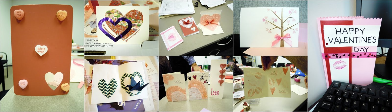 My coworker came up with a great idea: making valentines at work! So we both pulled together some of our crafting supplies, booked one of the conference rooms last Wednesday, and let our coworkers drop in anytime during a three-hour period to make valentines. It was such a great success! We work with some really creative folks, and it was fun to see what people came up with.