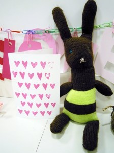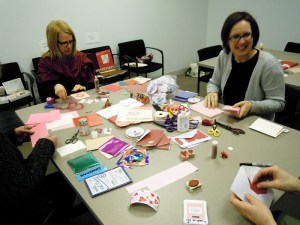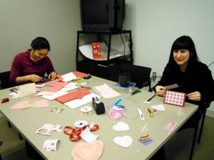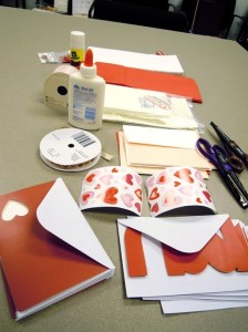 I divided up some card bases, envelopes, stickers, glue, ribbon, and decorative scissors amongst three tables and set aside some rubber stamps, ink pads, paper scraps, and foam self-adhesive conversation hearts (found those at Michael’s) for people to use.