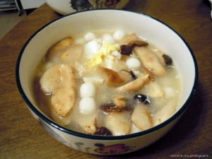 And my dinner was essentially a rice cake soup that started off as boiling water that was used to cook them in, and I added an egg, a couple of anchovies (for flavor), and mushrooms. It was quite delicious actually … I love the texture of the rice cakes.