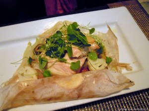 Salmon al Cartocchio baked in parchment with radishes, fennel, celery, carrots & cauliflower served with arugula butter & Meyer lemon