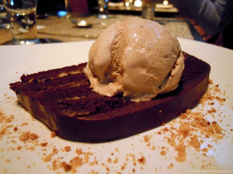 The Torta Santa Monica dessert: rich chocolate cake, layered with ganache, caramel & fleur de sel, served with vanilla gelato & almonds