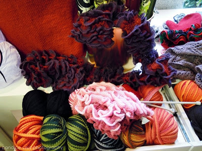 I found this really cool ribbon yarn by On-line Yarn that knits up in ruffles. One of the ladies that works at the shop was kind enough to explain how to pick up just the edge of the yarn (the yarn itself looks like it was knitted) to create the effect. I bought a few skeins to make a scarf in a fun, bright orange shade (in the picture below, it’s the skein at the far left) plus some in a grey scheme (the skein underneath the pink knitted sample) for a more conservative palette.