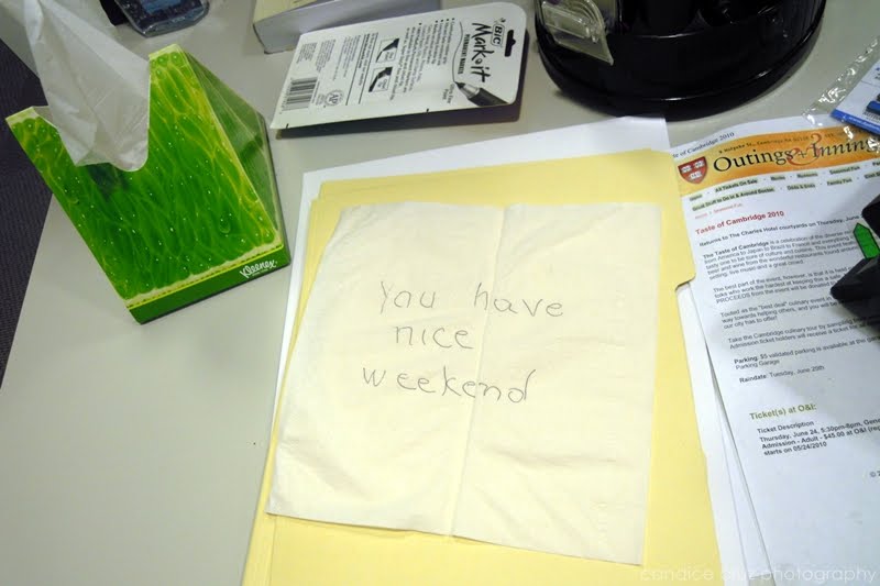 This totally made my day today, the Friday before a long weekend, where everyone else in the office managed to leave early but I was there till the end (okay, 4:56 pm … close enough to 5:00!). Our shuttle driver, Arben, came up for coffee and left me this note when I wasn’t at my desk. Super sweet!