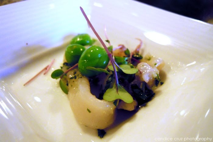 The amuse-bouche of the night was sauteed calamari served with fresh peas (don’t worry, I transferred my peas to her dish). It was quite delicious and flavorful. And just really pretty to look at presentation wise.