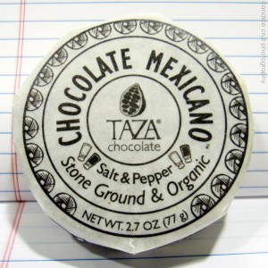 I think it’s possible that I am the only person that gets excited about new chocolate flavors, especially when it involves Taza. I stopped by Bloc 11 for an afternoon caffeine fix on Friday and came across their display of two new Taza chocolate flavors — coffee and salt & pepper — so I picked up a salt & pepper bar to try. If you haven’t had one of their chocolate discs before, they come with two per pack and it’s really easy to break them into 8 pie-wedge pieces for easier sharing. Which is what I did and it was interesting to see other people’s reactions. Some, like me, really liked the new flavor and the savoriness but others thought it was either a little too salty or a little too peppery. I know in general, some people don’t like the chalkiness of their chocolate. I don’t get it all that often but I find that I seek it out when I’m looking for chocolate with a lot of texture. Of course, in the end, there weren’t very many complaints about free chocolate on my desk and it seemed to do a disappearing act.