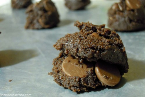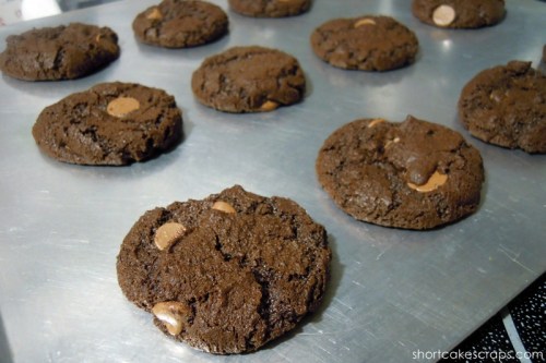 I took a recipe for double chocolate cookies and added a little twist to them. Okay, truth be told, I had to compromise and use some ingredients in our cupboard that weren’t in the original recipe. Alas, a wonderfully chocolate creation was born. What’s also great about this recipe is that it can be done all in one big bowl which means less to clean up.