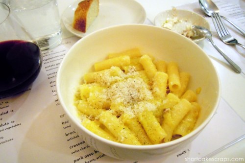 After divulging my pitiful potato news to our waiter that night (he was our waiter the last time we were there and remembered me/us), it was nice to know that they would be able to make me something using a different kind of pasta with the mushroom sauce. But this time I opted to try the the rigatoncini carbonara dish which is served with blue aracuana egg, guanciale, and black pepper. Wow. It was extremely good! I loved the guanciale (an unsmoked Italian bacon prepared with pig’s jowl or cheeks) and how it was crispy in texture, a nice contrast to the creaminess of the egg sauce. Each little cube packed so much flavor, I could’ve easily eaten a whole bowl of just guanciale on its own!