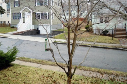 Trying to be all cute hiding behind one of the branches. Oh I see you, you seed stealing creature. Hence, the bird feeder has been moved to a taller branch farther away from their reach. Let’s hope this does this trick.