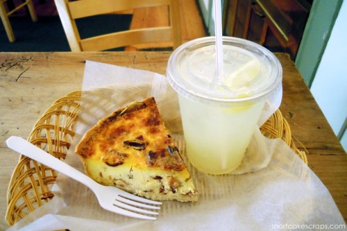 On this particular day, I was in Cambridge on campus helping a candidate get from interview to interview (he was from out of town) and I realized I’d have a few minutes in between enough to get a bite to eat. It was abnormally warm that day and I stupidly had worn my long-johns under my pants (yes, I’m one of those winter wimps … I am always cold!) and I had my long black jacket with me, so you know I was sweating as I hustled around the square. I remembered that Hi-Rise has a small bakery/cafe so I stopped by to see what they had available. I got a slice of their quiche Lorraine (mmm … bacon!) and a nice big cup of fresh squeezed lemonade. It certainly hit the spot! They had their patio furniture set up outside but it was full so I sat upstairs where it’s nice and quiet. The quiche was so deliciously rich but it all washed down nicely with the ice-cold lemonade.