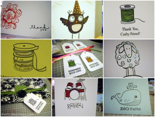 Trying to get back into a creative mode, I sat down in our nicely cool basement and went to work reacquainting myself with my rubber stamp collection. Yes, I know these are pretty basic cards but you gotta start somewhere even if it’s slow, right? Also trying a new thing with little “handmade with love” gift tags for knitted and sewn gift items.