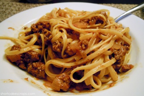 I made a super simple sauce with ground beef (sirloin), onion, garlic, fresh oregano, a little bit of anchovy paste, canned tomato sauce, salt and pepper. We enjoyed it with linguini noodles and romano cheese.