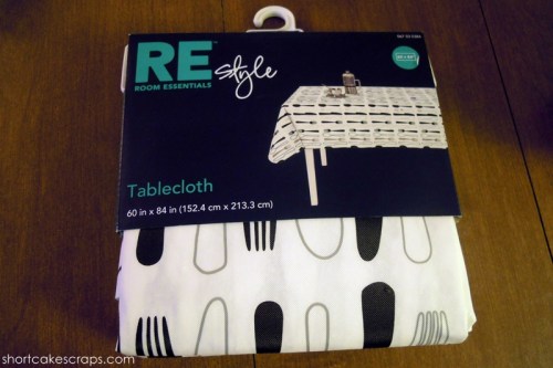 Then the very next day, I was strolling through Target and stumbled upon this super cute tablecloth with utensils all over it. I thought, “This is a little too noisy for our table,” and then started to walk away when I realized that wait! It’s got a slick surface on top. <Turn package over> What? It’s wipeable, you don’t have to wash it to clean it? Hmmm … this just might work!