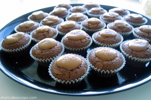 9. The cupcake recipe instructs you to peel the wrapper off each of them and to proceed by coating the bottoms of them in melted chocolate. In this case, I kept the wrappers on and packed them into a Tupperware container to carry to work the next day. To construct them, simply put a dollop of the caramel on top of each cupcake and sprinkle with a little bit of coarse sea salt. Enjoy!