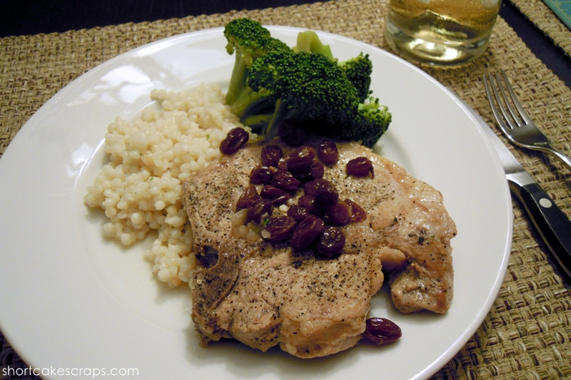 I added a couple of tablespoons to a large pan over medium heat and then added the salt and pepper seasoned pork chops (bone-in). I cooked each side for about 3 minutes and then turned the heat down to low, added some white grape juice to the pan (about 1/2 way up the sides of the chops), a handful of raisins and put the lid on the pan to let it simmer an additional 15 minutes. During the last 5 minutes of cooking I added some broccoli to allow it to steam a little bit, then served with some Israeli pearl couscous.